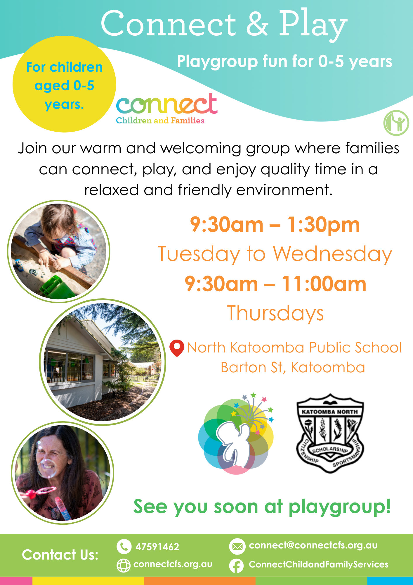 Connect have facilitated Connect and Play playgroups across the mountains for over 15 years. They are a regular part of family life for many families in our community. A place for parents and carers to meet with friends, where children can meet and play and learn new skills, where community information is shared and morning tea is available.